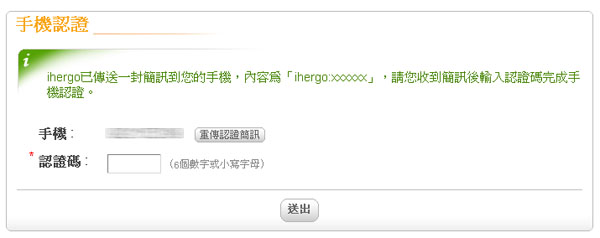 填入最後六位數的認證碼,點選送出即可完成手機認證。由於 ihergo 限定每人一天只能傳送一封簡訊,如您不小心輸入錯誤的手機號碼,可以在隔天「重傳認證簡訊」。完成手機認證後,如您變更了手機號碼可以寄 Email 至 [email protected] 請站方幫您更改。
