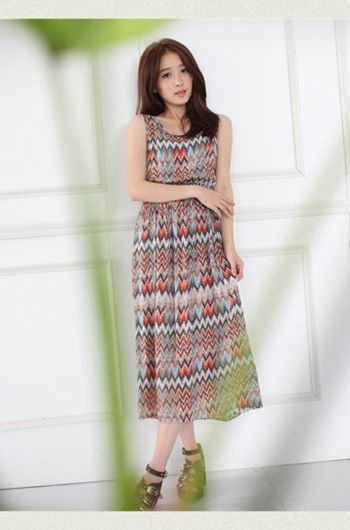 【ENT114】夢幻圖紋高腰無袖氣質款牛奶絲洋裝