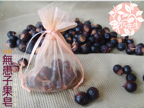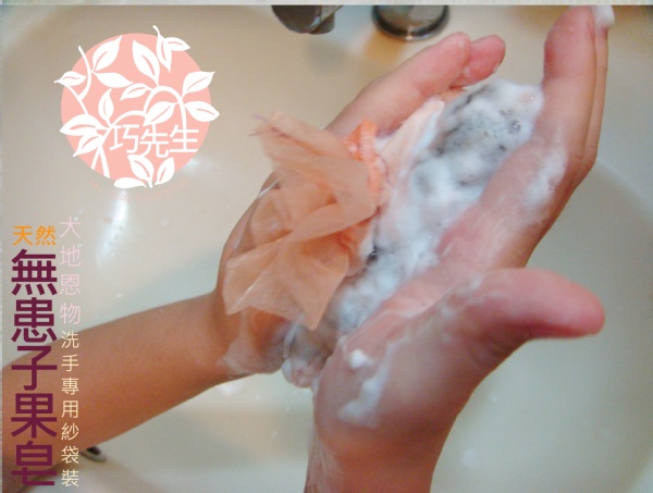 使用說明:先將無患子裝入小紗袋內,束口處打一個小結,沾水搓揉。
