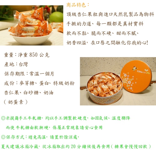 本店其他商品 查看全部 晶饌禮盒 $620 8入鳳梨酥 $160 經典-鳳梨酥+餅乾 $450 經典-牛軋糖+鳳梨酥 $390 經典-牛軋糖+餅乾 $390 經典-4罐手工餅乾 $450 分享禮盒組 $400 養生堅果 $250 紅茶杏仁餅 $110 番薯芝麻餅 $110 可可(小)品味包 $160 原味(小)品味包 $160 布拉克-手工餅乾 $110 雷諾瓦-手工餅乾 $110 薄邱尼-手工餅乾 $110 米羅-手工餅乾 $110 嚐之心禮盒-巧克力 $99 提香乳酪球 $198 雪之御禮盒-綜合口味 $150 雪之御禮盒-原味 $150