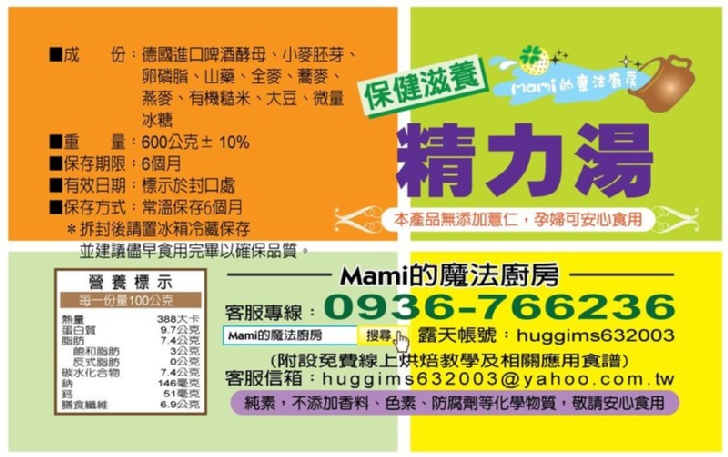 本店其他商品 查看全部 頂級手作肉鬆●網友公認優於美x香/ 新x陽的頂級手作肉鬆~限量供應 (4包以上免運費,全館商品可合併 $170 頂級手作肉鬆●網友公認優於美x香/ 新x陽的頂級手作肉鬆~限量供應 (4包以上免運費,全館商品可合併 $170 ]『有機糙米漢方穀粉(extra加強配方)』中醫師與營養師聯合,特別針對幼兒易感冒之體質調配,厭奶期 $279 『活力滋補寶典』(無加糖配方) *沖泡式穀粉溫馨上市 ~網友瘋狂轉載的私房寶典 $166 super配方有機糙米雜糧穀粉☺特別為三個月以上嬰幼兒設計的專用 配方☺大人也可以食用~ $218 追加訂購商品 $999 】『天然燕麥健美穀飲』,含豐富山藥、燕麥、薏仁※喝得到天然燕麥的顆粒喔!※結團後新鮮現做 $195 『漢方草本●28味養生堅果飲』* 中醫師與營養師聯合調配*特別加強漢方草本及豐富堅果調和而成* $319 #304不鏽鋼杯子專用『打奶器』(攪拌器)*台灣製* 沖泡各式飲品不再有結塊的困擾囉! $38 [ 原汁黑芝麻醬』(麵包抹醬)◆ 來自台灣本產優質黑芝麻 ◆ 無調味、無添加香料、防腐劑 ~ 純素 $270 非基因改造『金色陽光有機豆漿粉』~即沖即飲,特別適合外出、出國、異鄉遊子們隨時享用 $178 團購『100%不抽油純黑芝麻粉』* 堅持以台灣本產頂級黑芝麻粒製作 ~ 謝絕以進口次級品來比價!! $169 合購沖泡式『十全養身精力湯』*是我們每天最佳的營養補充飲品!! $267