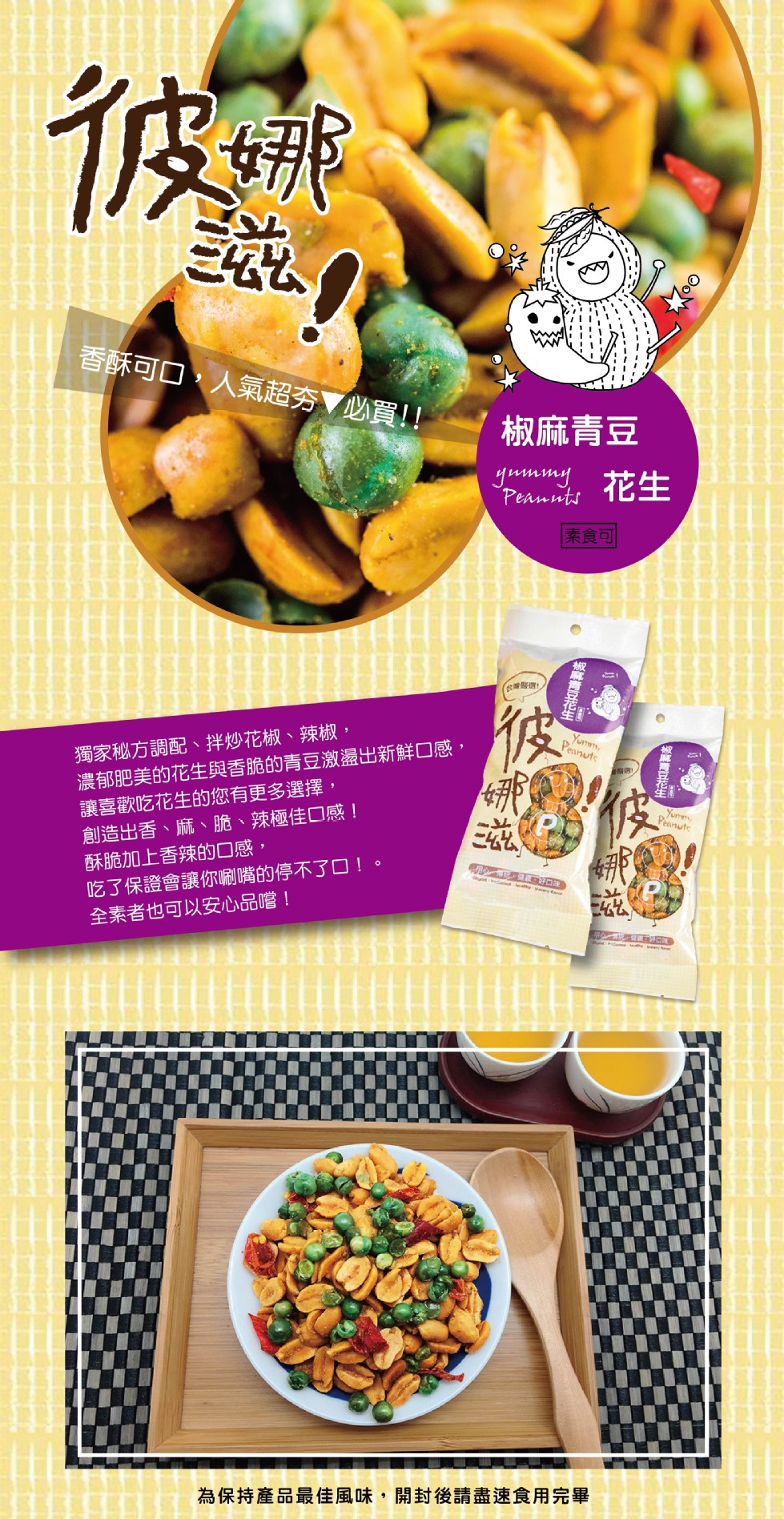 商品說明 【彼娜滋】椒麻青豆花生-分享包(全素)✨人氣超夯▼必買!!✨香味撲鼻,令人食指大動✨多層次口感,超唰嘴✨產地直送手工嚴選,通過國際SGS驗證,吃得更安心! 保存期限:90天 注意事項:※本商品請勿冷藏 請勿冷藏 請勿冷藏 請勿冷藏※爲保持產品最佳風味,開封後請盡速食用完畢。 ※我們的產品全面通過國際SGS黃麴毒素與農藥殘留檢驗,並有1000萬產品責任險,吃得更安心!