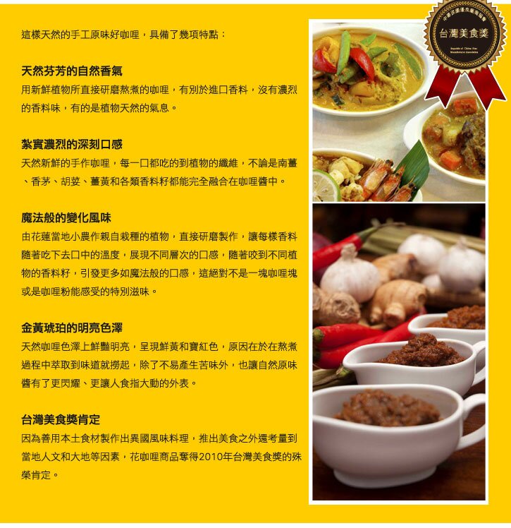 商店資訊 逛逛商店 [分享商店] 家咖哩 30 商品 0 團合購 顧客評價星等 商品介紹 家咖哩料理包-養生鮮蔬口味(全素)(內含3包)。(商品照片為實體拍攝,絕對顛覆你對市售料理包的印象) 由花蓮家咖哩參考店裡的人氣美食生產製作而成,想盡辦法讓餐廳的美味也可以透過更方便的方式給大家品嘗。以花蓮小農新鮮食材和香料,生產而成,不含任何防腐劑和人工調味料,有別於市面上的料理包喔。最重要的是,份量非常足夠(固定量至少140g),可以常溫存放一年,不含任何防腐劑和人工調味料,非常適合現在少開伙的單身貴族和小家庭。 家咖哩料理包-養生鮮蔬口味(全素)(內含3包)。(商品照片為實體拍攝,絕對顛覆你對市售料理包的印象) 由花蓮家咖哩參考店裡的人氣美食生產製作而成,想盡辦法讓餐廳的美味也可以透過更方便的方式給大家品嘗。以花蓮小農新鮮食材和香料,生產而成,不含任何防腐劑和人工調味料,有別於市面上的料理包喔。最重要的是,份量非常足夠(固定量至少140g),可以常溫存放一年,不含任何防腐劑和人工調味料,非常適合現在少開伙的單身貴族和小家庭。