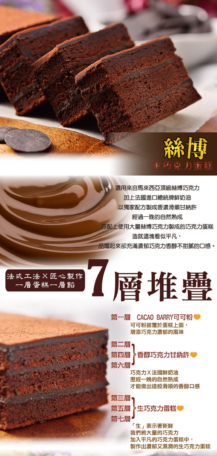 商品說明 選用來自馬來西亞頂級絲博巧克力,加上法國進口總統牌鮮奶油,以獨家配方製成香濃滑順甘納許,經過一晚的自然熟成,搭配上使用大量絲博巧克力製成的巧克力蛋糕,造就這塊看似平凡,品嚐起來卻充滿濃郁巧克力香醇不甜膩的口感。※團購、伴手禮、聚會、彌月首選 保存期限:冷藏4天,冷凍7天