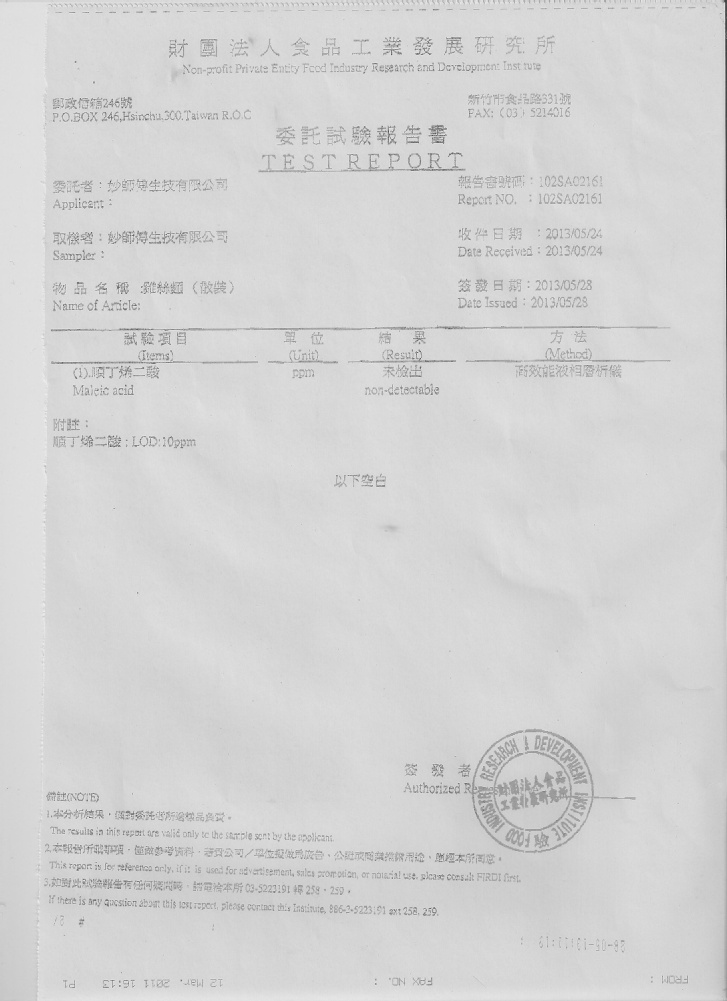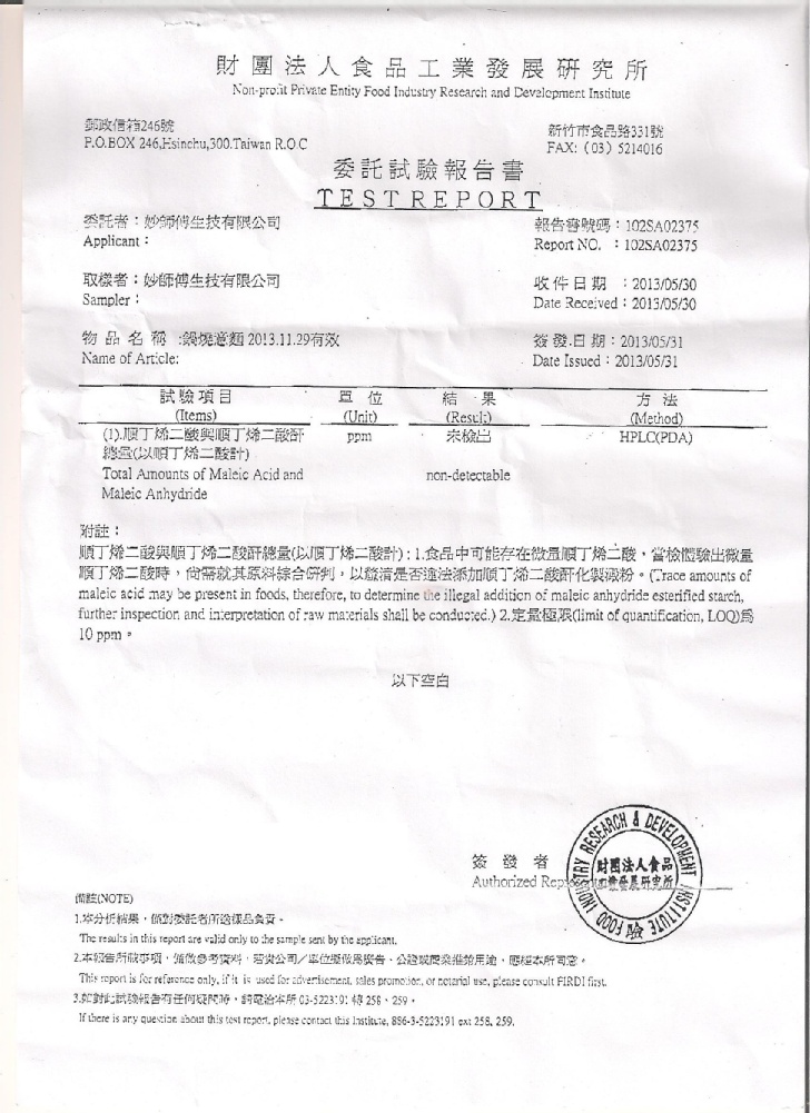 商品說明 請放心食用與購買。委託 食品工業研究所檢驗 ,於5/24送件並於5/28取得檢驗報告,確認證實 本賣場產品不含『順丁烯二酸』成分。繼續拼了,主購團員拼美食,全壽好吃拼經濟。大家一起『愛合購』~~2013.05.29 全壽好吃-雞絲麵