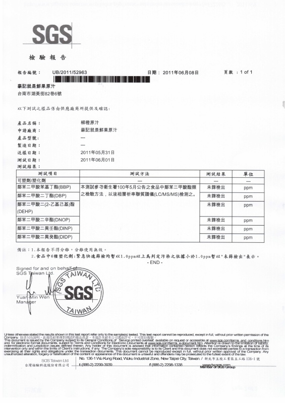 說明:符合CNS2377國家標準天然果汁類以及SGS檢驗無塑化劑