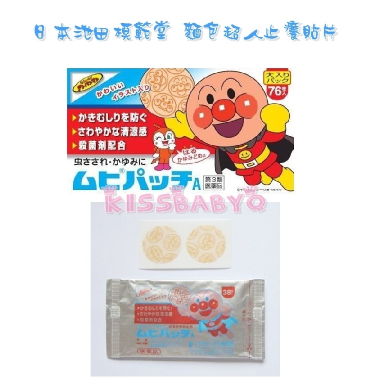 商品說明 ★這一款止癢貼片,是用於當小朋友被蚊子叮咬後所貼的貼片!(直接貼在蚊子叮咬的腫包上,有止癢消炎的效果,清涼感覺!貼上去就不怕抓破皮)★由於造型可愛,小朋友貼上後都會捨不得撕下來,也捨不得抓掉★麵包超人建議父母別讓小朋友貼太久約4~5小時請更換新的貼布,因為此款貼部會有點微微的清涼感貼太久反而沒用且建議入浴時請撕下,沐浴完畢後更新!★建議一歲以上的小朋友使用,以免誤食!產地:日本產品網址:http://www.ikedamohando.co.jp/products/anpanman/muhi_patch_a.html 注意事項:★日本代購商品部分現貨,無現貨商品將採預購並於每週五結單,隔週一寄出週二到貨。★確認購買請下單入帳享有商品數量優先保留權。例如:您週一下單入帳則下週二可收到商品。您週三下單入帳則下週二可收到商品。