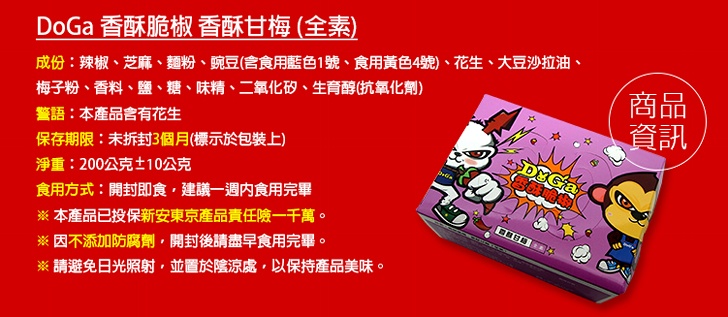 DoGa-香酥脆椒 香酥甘梅 (全素) 香酥脆的辣椒餅乾喔!!! 原價$200 優惠 $180 買氣909人 售出1723份 分享 : 加入購物車 數量 原價$200 優惠$180 滿3000元免付運費100元