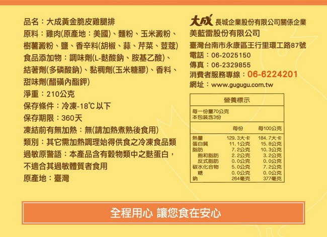 原料:雞肉(原產地:美國)、麵粉、玉米澱粉、樹薯澱粉、鹽、香辛料(胡椒、蒜、芹菜、荳蔻)