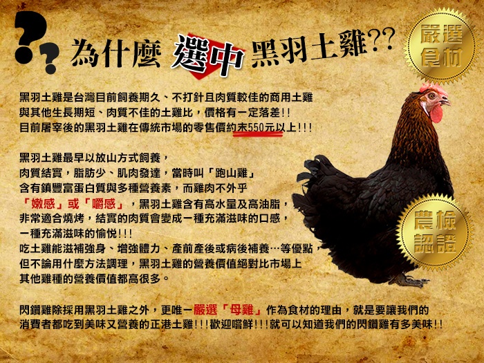 ◆嚴選認證黑羽土雞,特採用龍眼子燻烤◆