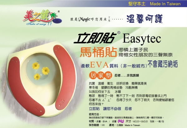 sequencechen (3):拿出來一定會被取笑的就是溫暖馬桶貼。今年北部過年非常冷,坐上冰冷的馬桶是種煎熬,尤其是半夜,貼了以後馬上對比出有貼到和沒有貼到的差異,剛開始老爸嫌說浪費錢,後來還打電話要我再多買2組。本來我還擔心不好清洗,沒想到撕下擦乾淨後可以反覆使用,真是聰明的設計,便宜又貼心的好東西。老爸要我向店家建議:設計大一些寬一些,貼覆範圍就可以更完整(太大自行修剪),沒坐準的時候被冷到的情形就可以減少了,供店家參考。