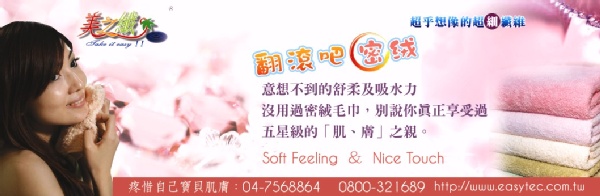 美之纖密絨毛巾是由超細纖維「雙面長毛絨」織成,給您意想不到的舒柔與潔淨力。Soft Feeling、Warm Feeling&Nice Touch。用過才知道什麼叫舒柔,沒用過美之纖密絨毛巾,別說你真正享受過五星級的「肌、膚」之親。