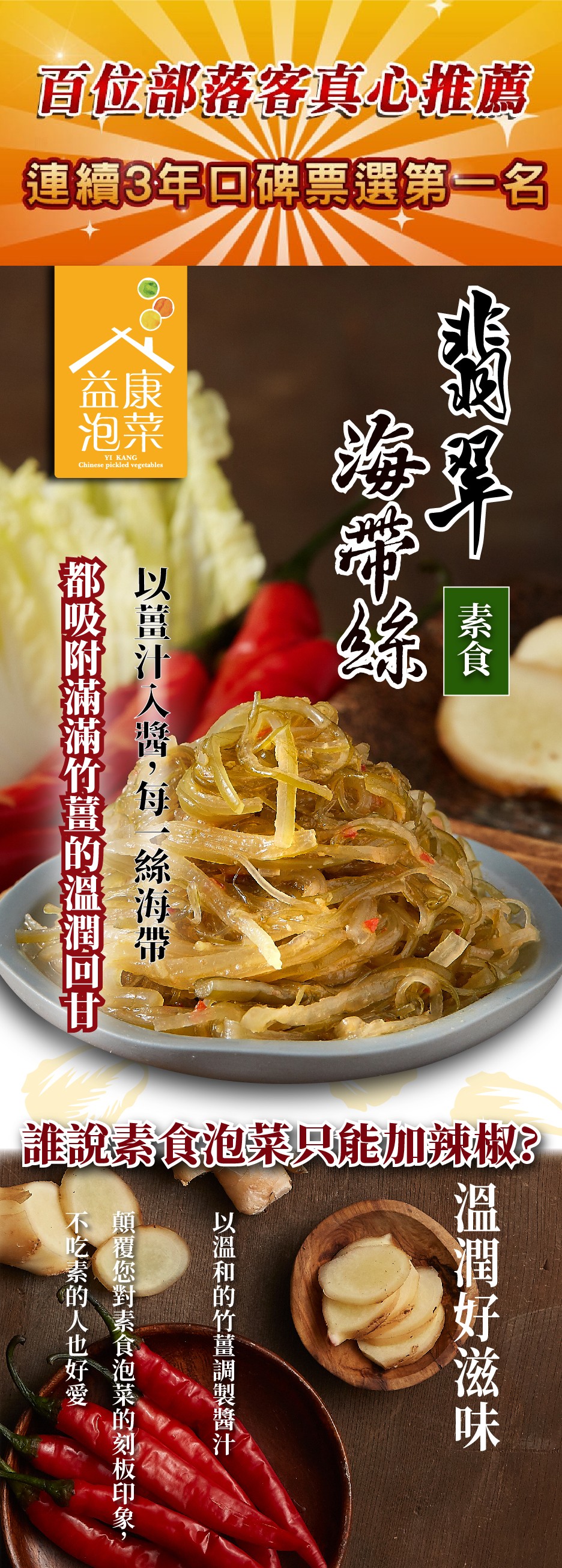 商品說明 產品名稱:益康泡菜 【素食】翡翠海帶絲規 格:450g±10g製造日期:接單後生產保存期限:冷藏一個月成份:海帶絲、糖、香油(大豆油、芝麻)、醋(水、糯米)、薑、辣椒、鹽、玉米糖膠產品特色:益康美食館為了吃全素的朋友們特別研發素食黃金海帶絲,採用功效較佳的老薑和獨特的山葵調製而成,對素食的朋友們來說,這絕對是您絕佳的選擇!