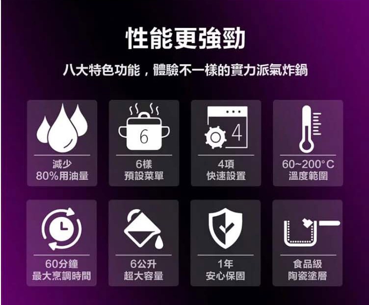 6公升超大容量、60分鐘超長時間、60℃最低溫度、6樣預設菜單