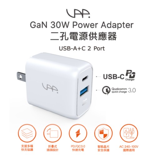 免運 享贈品 【VAP官方直營】 現貨PD雙孔快充充電器30W GaN 氮化镓充電器(Type-A+Type-C)