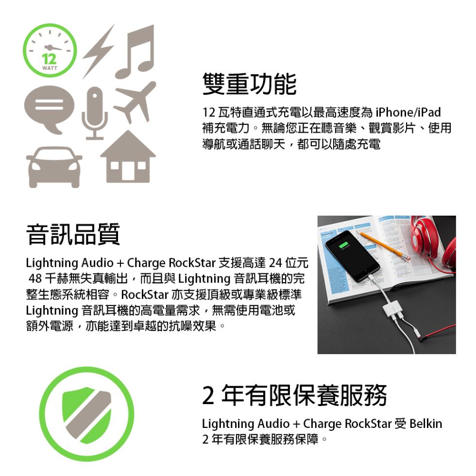 Lightning Audio + Charge RockStar 受 Belkin 2 年有限保養服務保障。Belkin International, Inc. (下稱「Belkin」) 向產品原購買者確保產品沒有設計、組裝、物料或製造上的瑕疵,此保用證為期 2 年。