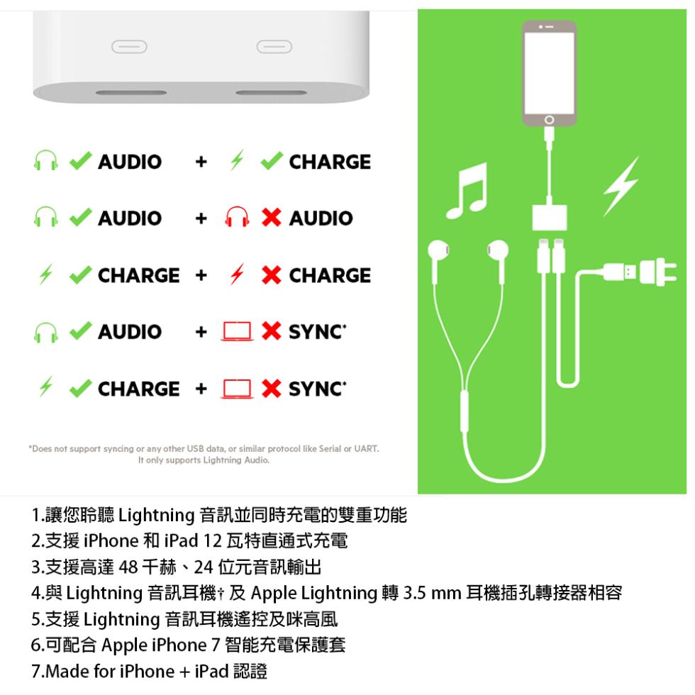 ■讓您聆聽 Lightning 音訊並同時充電的雙重功能