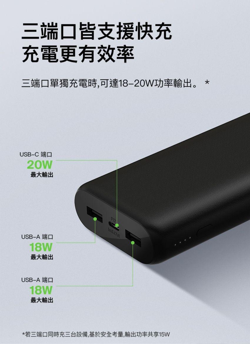 ▪ 3 個端口:1 個 USB-C 和 2 個 USB-A,可同時為 3 個設備充電