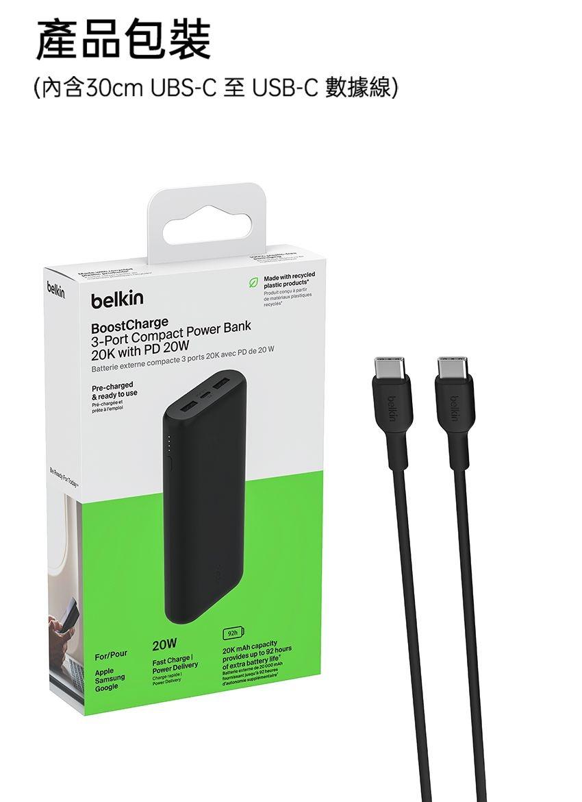 免運 Belkin 貝爾金 BOOSTCHARGE PD20W 3孔行動電源 20K(附線) BPB014