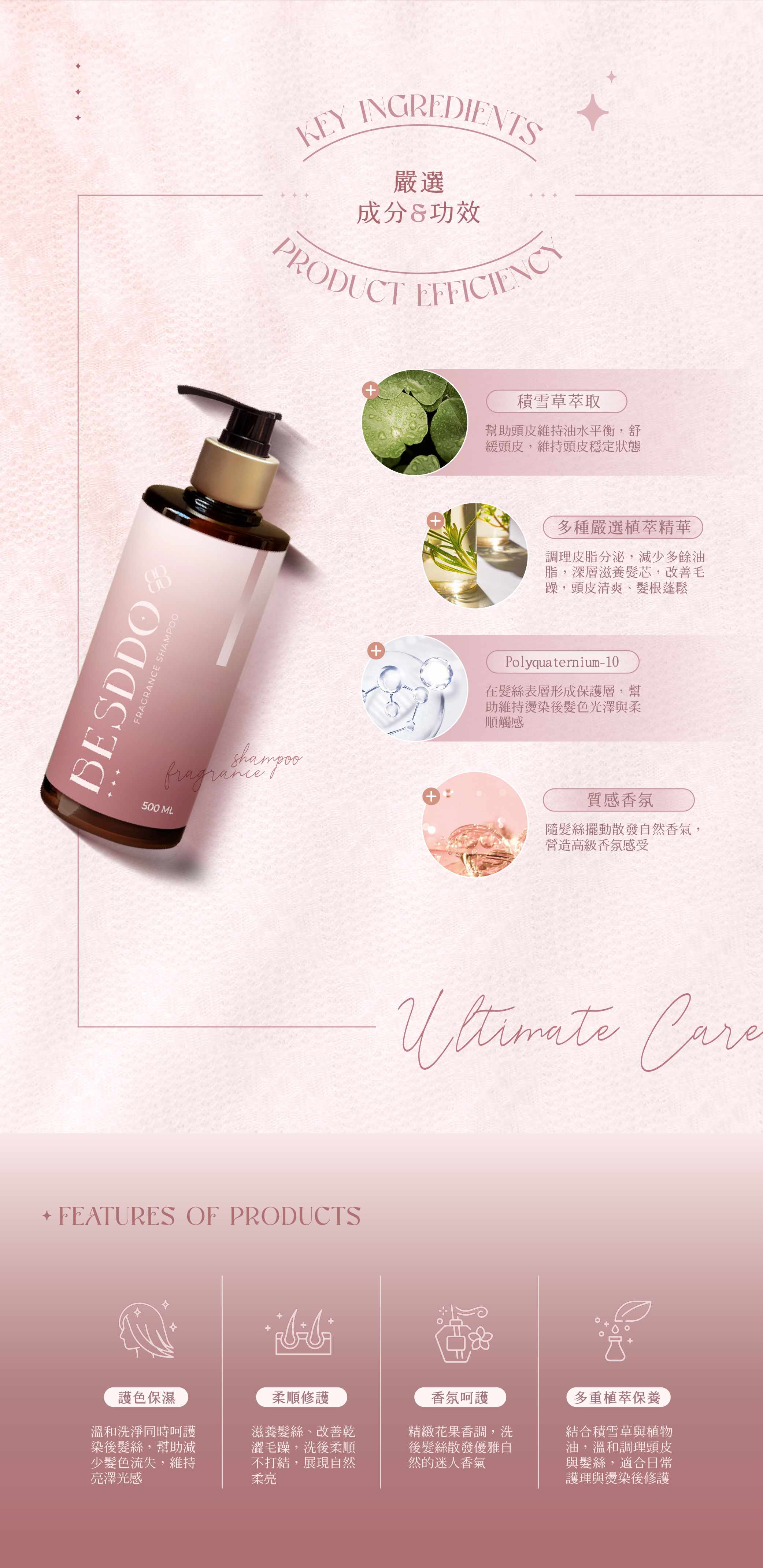 • Polyquaternium-10:形成保護層,護色與柔順 • 嚴選植萃精華:調理頭皮油脂,提升蓬鬆感