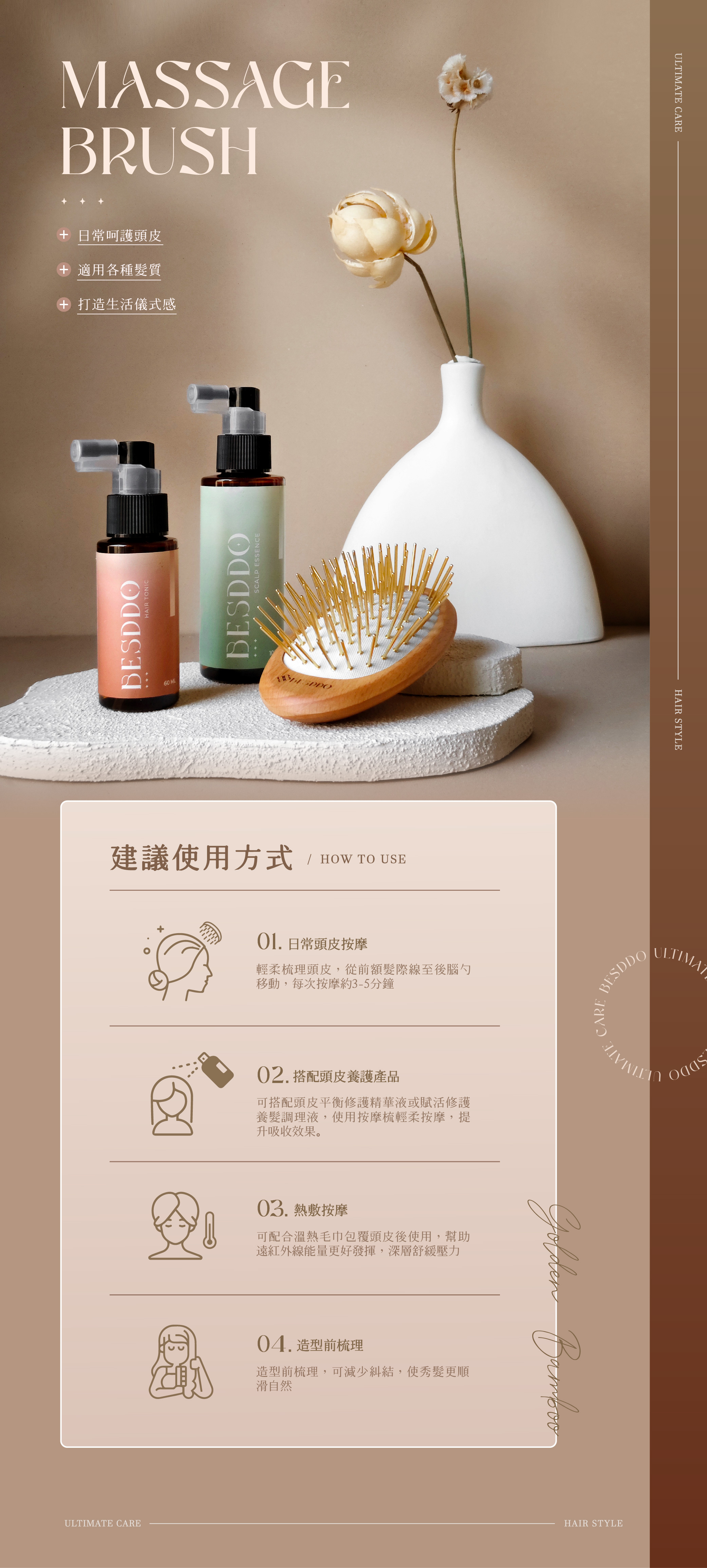 ✔ 日常按摩:早晚梳理3–5分鐘,幫助放鬆頭皮與減壓