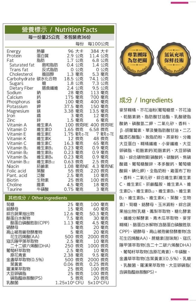 麥芽糊精、芥花油粉(葡萄糖漿、芥花油、乾酪素鈉、脂肪酸甘油酯、乳酸硬脂酸鈉、磷酸氫二鉀、二氧化矽、香料、B-胡蘿蔔素、單及雙脂肪酸甘油 •二乙醯酒石酸酯)、脫脂奶粉、燕麥粉、分離大豆蛋白、糊精纖維、小麥纖維、大豆卵磷脂、乾酪素鈣(乾酪素鈣、大豆卵磷脂)、綜合礦物質(磷酸鈣、碳酸鈣、焦磷酸鐵、葡萄糖酸鋅、本多酸鈣、葡萄糖酸銅、碘化鉀)、全脂奶粉、雞蛋布丁粉、香料、二氧化矽、綜合維生素(維生素C、維生素E、菸鹼醯胺、維生素A、維生素D3、維生素B12、維生素B1、維生素B2、維生素B、維生素K1、葉酸、生物素)、菊糖、鉻酵母、玉米澱粉、綜合蔬果抽出物(乳糖、鳳梨萃取物、糖化酵素、纖維分解酵素、青木瓜萃取物、麥芽糊精)、酪蛋白水解物(含酪蛋白磷酸胜肽CPP)、硒酵母、高山被孢徽發酵產物(含花生四烯酸AA)、蔗糖素(甜味劑)、寇氏隱甲藻萃取物(含二十二碳六烯酸DHA)、葡萄籽萃取物(含原花青素)、牛磺酸、金盞草萃取物(含葉黃素)(0.5%)、乳糖、乳酸菌、羅漢果萃取物、大豆卵磷脂(含磷脂醯絲胺酸PS)。