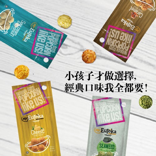 - 品項: EUREKA爆米花 – 經典焦糖 \ EUREKA爆米花 – 酸奶香蔥 \ EUREKA爆米花 – 地中海番茄 \ EUREKA爆米花 – 濃郁起司 \ EUREKA爆米花 – 原味海鹽 \ EUREKA爆米花 – 燒烤BBQ \ EUREKA爆米花 – 芥末 \ EUREKA爆米花 – 南洋咖哩 \ EUREKA爆米花 – 岩燒海苔 \ EUREKA爆米花 – 玉米濃湯 \ EUREKA爆米花 – 可可麥芽 \ EUREKA爆米花 – 奶油糖