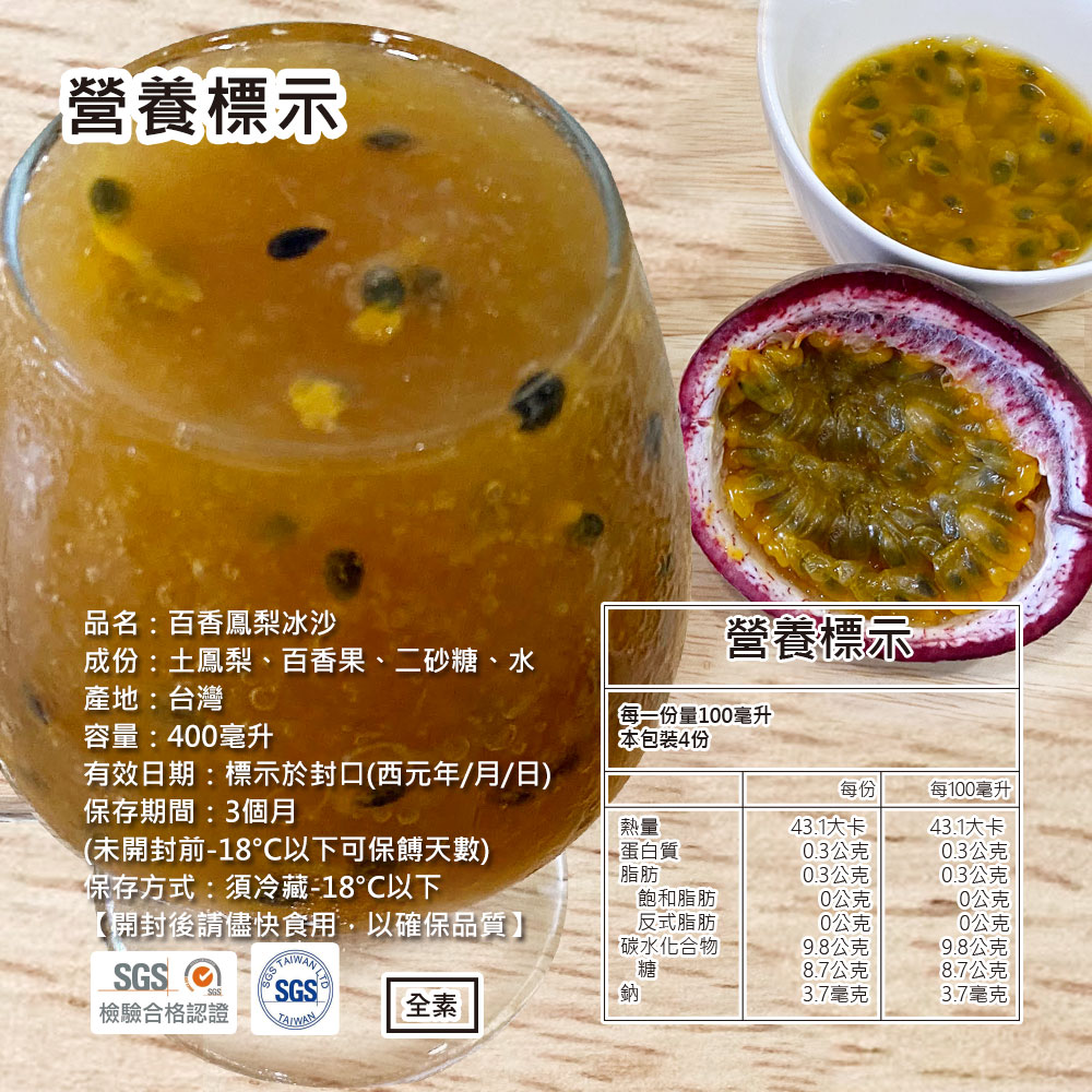 成份、食品添加物名稱:土鳳梨、百香果、二砂糖、水