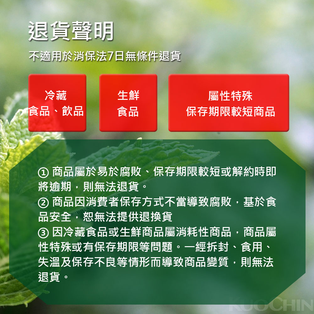 二、【生鮮冷凍食品/易腐壞食品】依法並不享有7天鑑賞期,依據「通訊交易解除權合理例外情事適用準則」,生鮮冷凍食品/易腐壞食品不適用「消費者保護法」第19條第1項解除權,除商品本身瑕疵或運送過程而造成的損毀,【請於到貨24小時內,並拍照存證2至3張圖】,才可申辦退換貨。