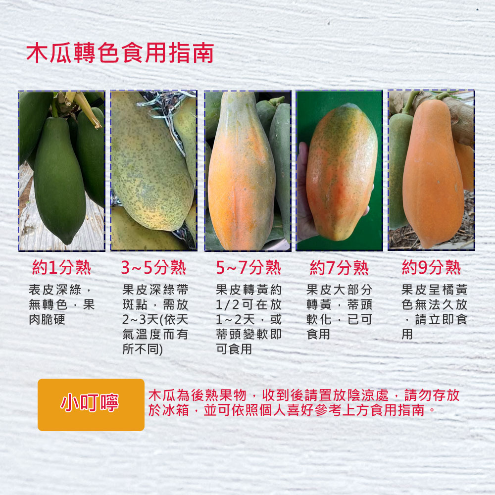 木瓜為後熟果物,收到後請置放陰涼處,請勿存放於冰箱,並可依照個人喜好參考圖文食用指南。