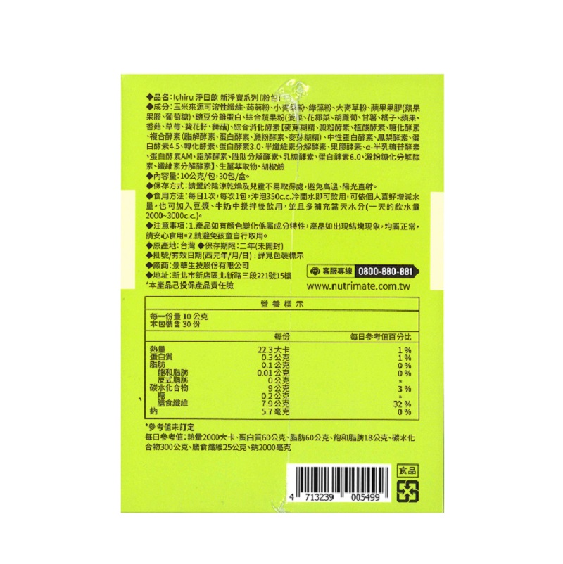 3.內容物/成分:玉米來源可溶性纖維、蒟蒻粉、小麥草粉、綠藻粉、大麥草粉、蘋果果膠(蘋果果膠、葡萄糖)、豌豆分離蛋白、綜合蔬果粉(菠菜、花椰菜、胡蘿蔔、甘薯、橘子、蘋果、香菇、草莓、葵花籽、舞菇)、綜合消化酵素【麥芽糊精、澱粉酵素、植酸酵素、糖化酵素、複合酵素(脂解酵素、蛋白酵素、澱粉酵素、麥芽糊精)、中性蛋白酵素、鳳梨酵素、蛋白酵素4.5、轉化酵素、蛋白酵素3.0、半纖維素分解酵素、果膠酵素、α-半乳糖苷酵素、蛋