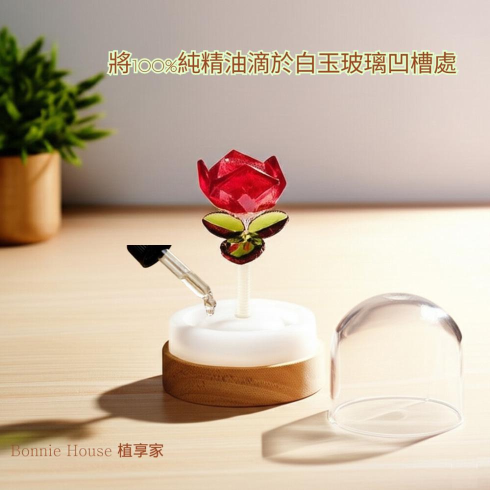 使用方法:將100%純精油滴於白玉玻璃凹槽處,建議用量約5-8滴可擴香2小時左右,並小心安裝花束