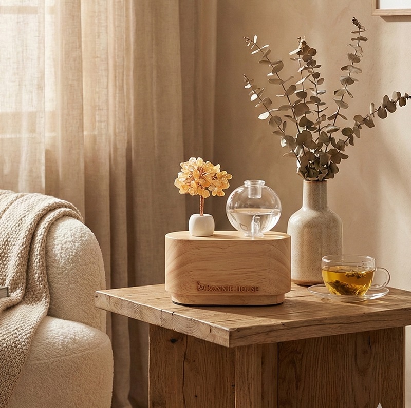 內容物組合:收納包x1、木座本體×1、玻璃霧化器×1、玻璃上蓋×1、USB 充電線×1、水晶樹磁鐵×1、塑膠滴管×1、清潔針×1、清潔棒x1