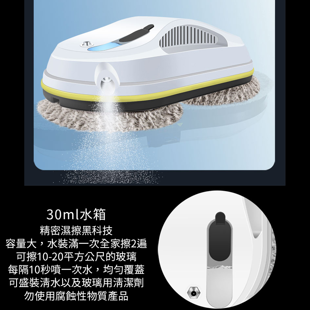 一邊噴水一邊自動擦拭,水箱容量大不必常常補水