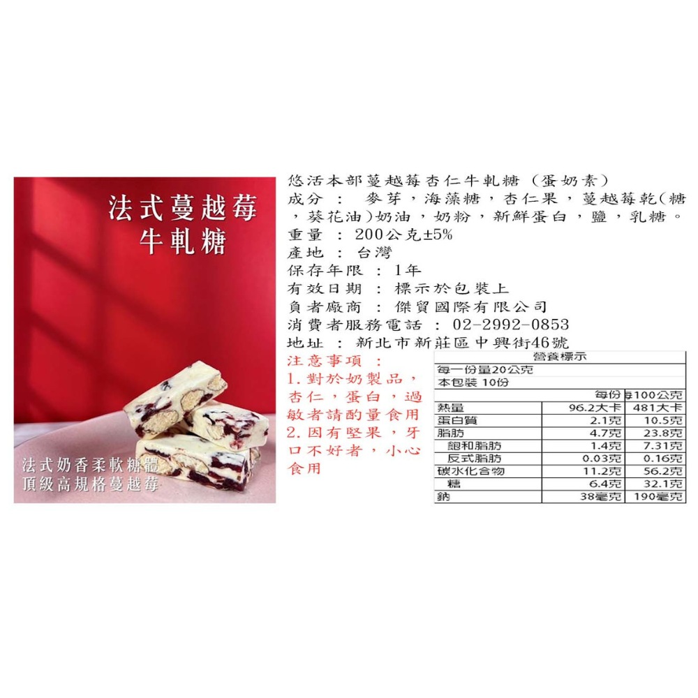 【食用方式】 A. 即開可食用 【產品成份】 成份 : 麥芽,海藻糖,杏仁果,蔓越莓乾(糖,葵花油)奶油,奶粉,新鮮蛋白,鹽,乳糖。 【商品規格】 包裝內容 : 單顆包裝 重 量 : 200公克±5% 【保存方式】 保存期限: 1 年 (係指未開封下且正常條件下之保存天數)。 保存方法: 如未開封狀態下,請放置陰涼處即可,拆封後請儘快食用。 有效日期 : 標示於包裝上 國 家 :台灣 【注意事項】 1. 對於麥芽,奶油,有過敏者請酌量食用。 2. 牙口不好者,請小心食用。