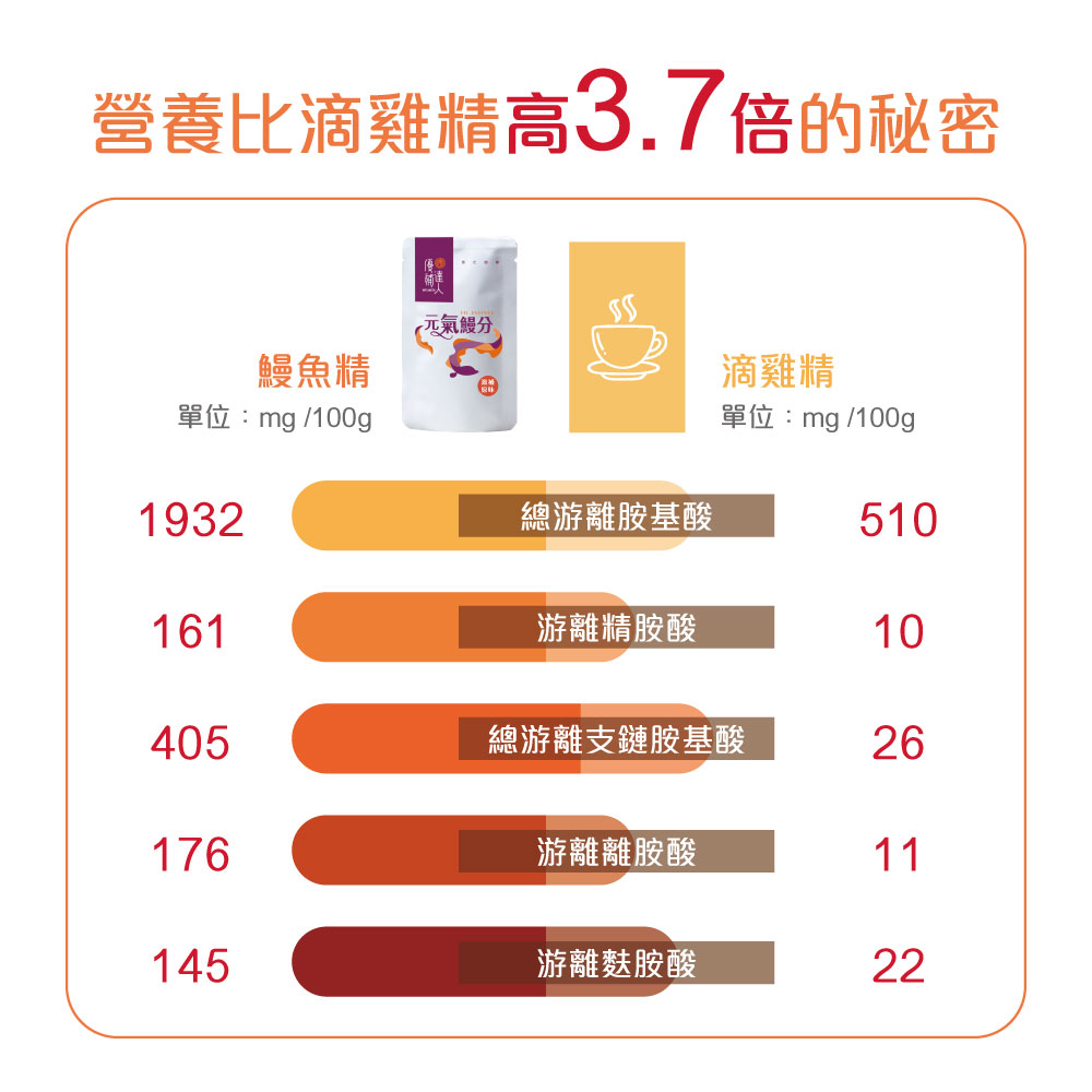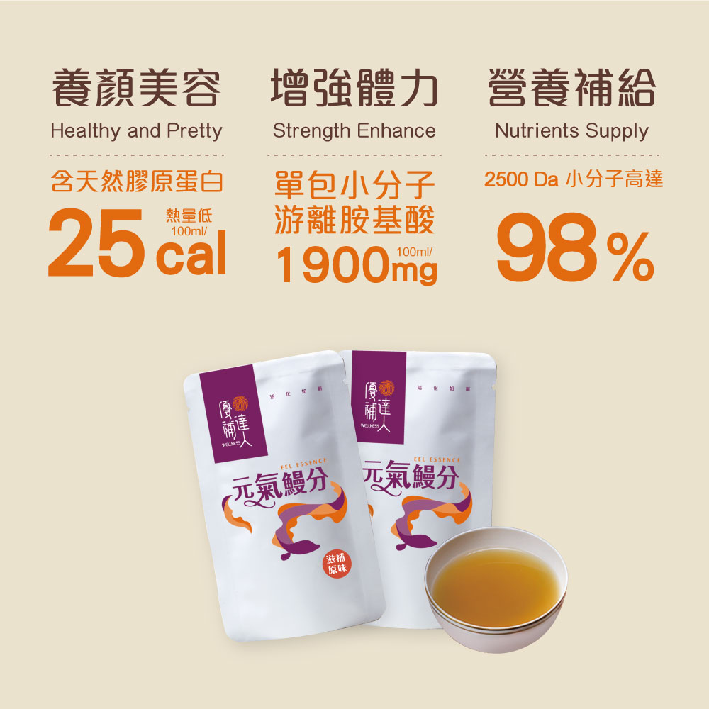 嚴選比照出口日本規格的優質白鰻,滋補原味鰻魚精含蛋白質、DHA、維生素D及鈣質,利用蔥薑提味,帶出鮮美鰻魚的香氣。