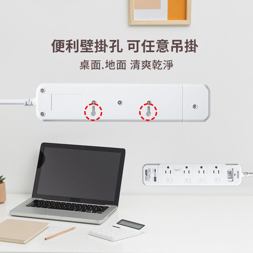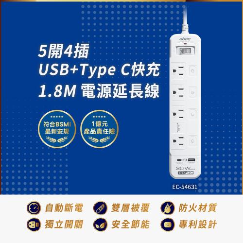 免運 Abee 快譯通 1.8M 電源延長線 5開4座+USB+Type-C PD 30W(EC-5463