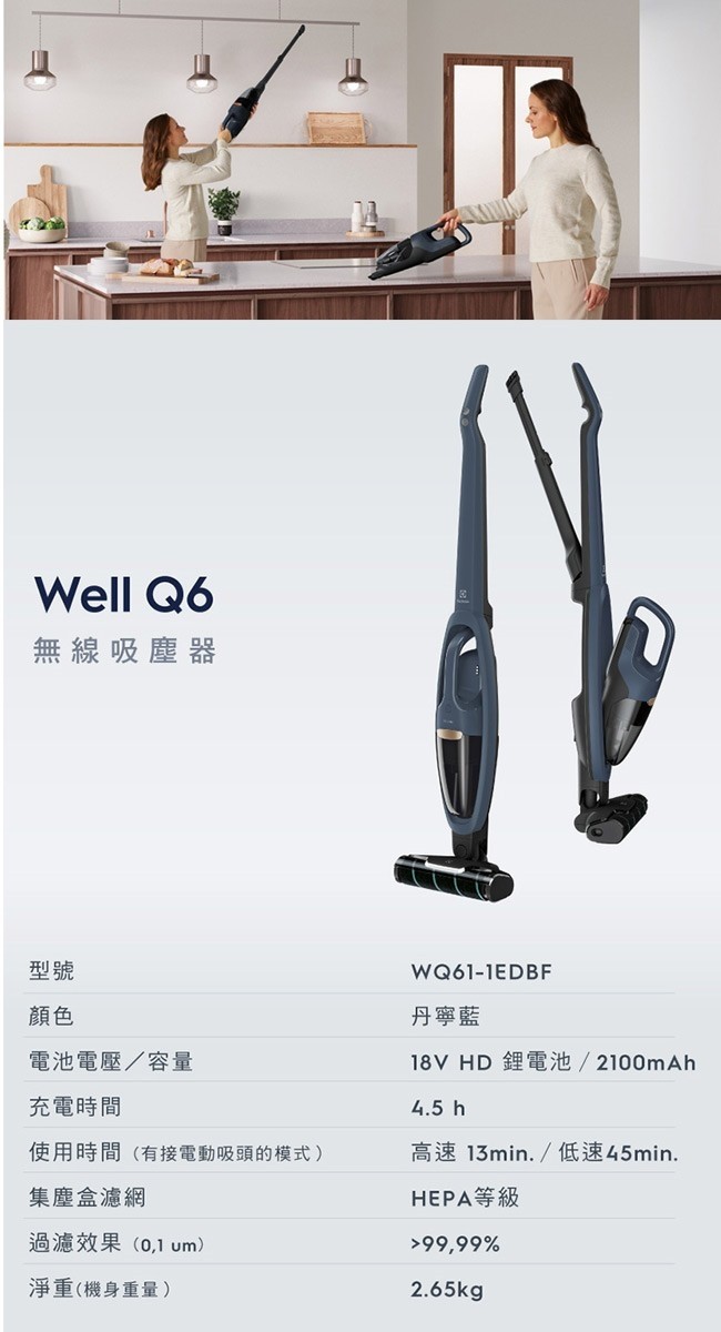產品名稱:【伊萊克斯 Electrolux】Well Q6無線吸塵器(WQ61-1EDBF)