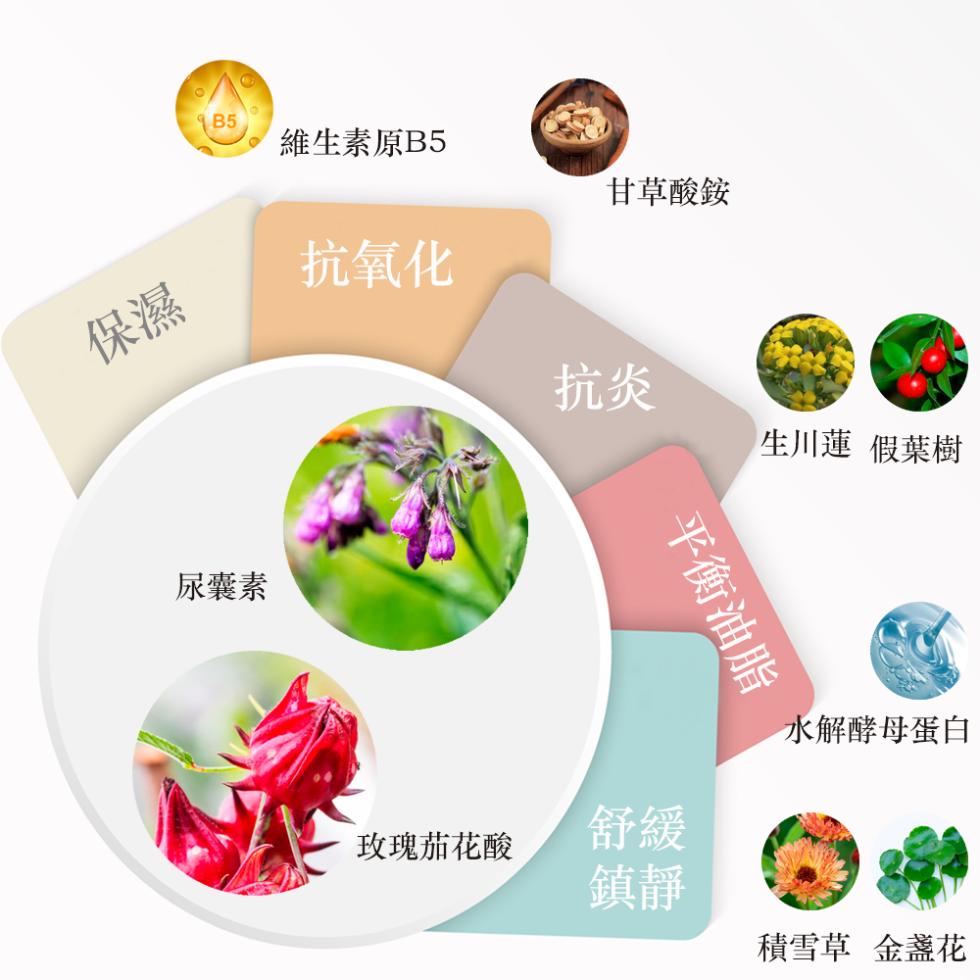 "紫草科植物"提煉而來,有"天然皮膚治癒劑"之稱號. 對肌膚具有舒緩、抗發炎、促進肌膚修復及增加肌膚保水能力