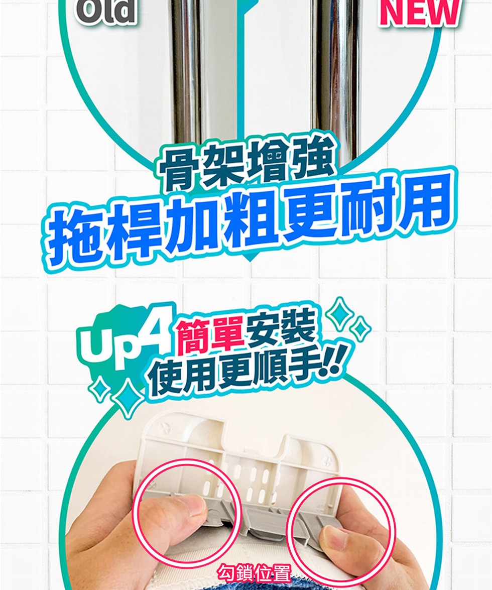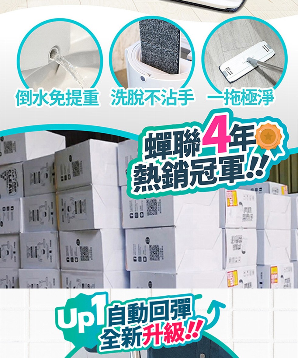 內容物:拖把桶(含上蓋、水塞)、平板拖把頭、拖把桿x3、握把桿x1、附:乾布x1、濕布x1、除塵刮棒