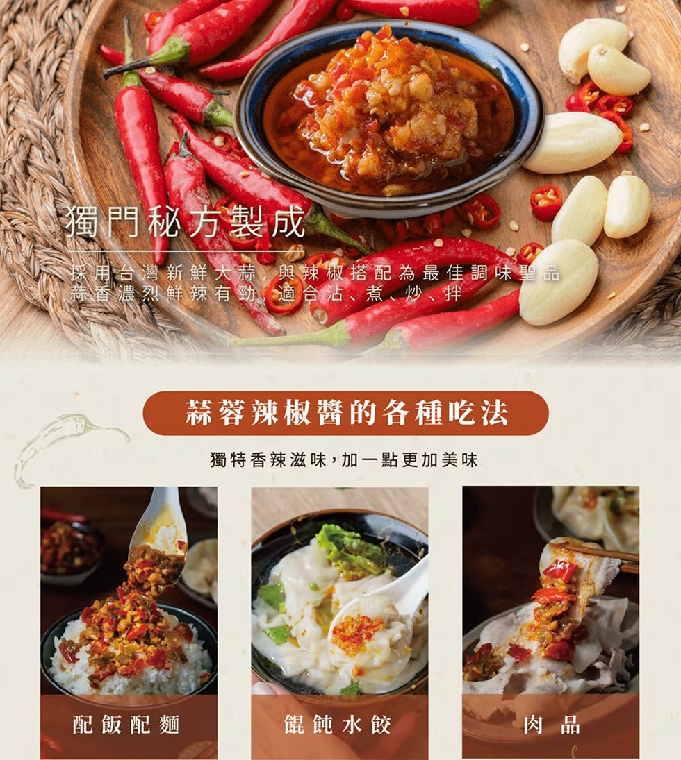 • 朝天椒、蒜頭、大豆油、芝麻油、食鹽