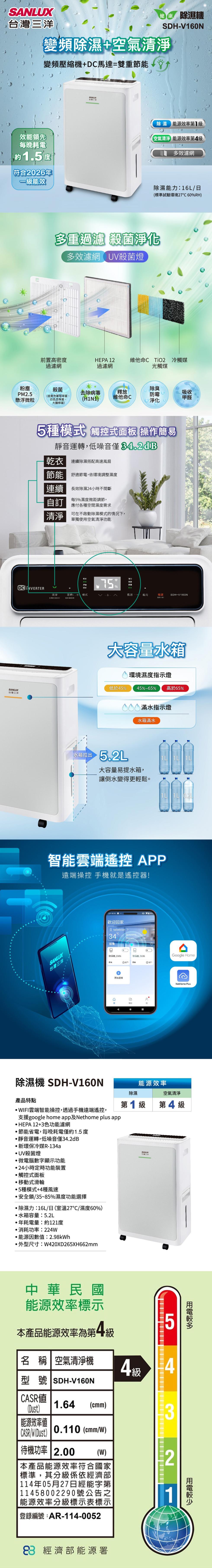 • 【SANLUX 台灣三洋】16L變頻空氣清淨除濕機(SDH-V160N)