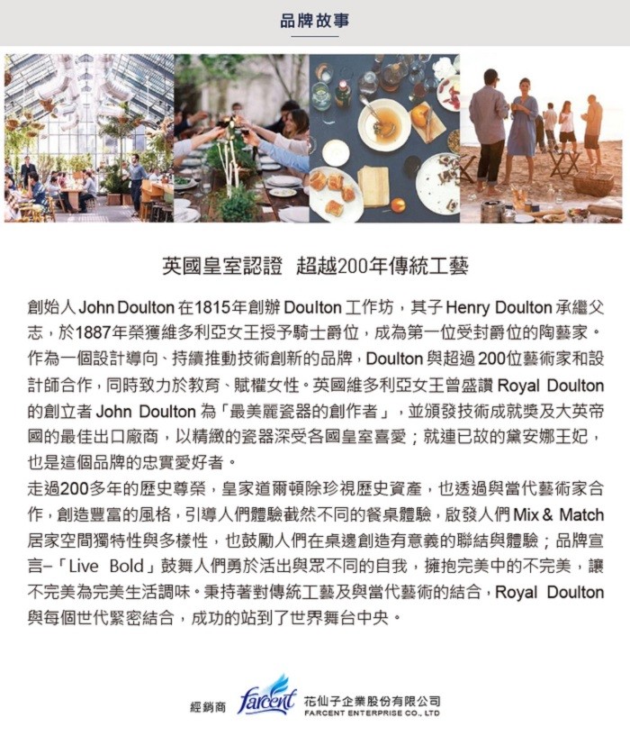 產品特色:Royal Doulton皇家道爾頓創立於1815年,擁有超過200年歷史,