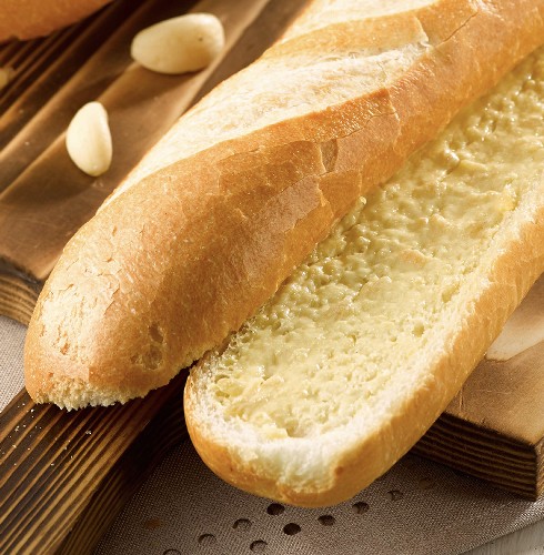 外皮酥脆、內餡鬆軟的經典法國麵包, 將之橫切之後,抹上豐富的自製大蒜奶油