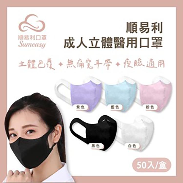 順易利口罩,順易利,成人立體醫用口罩,立體包覆+無痛寬帶+瘦臉適用,50入/盒。