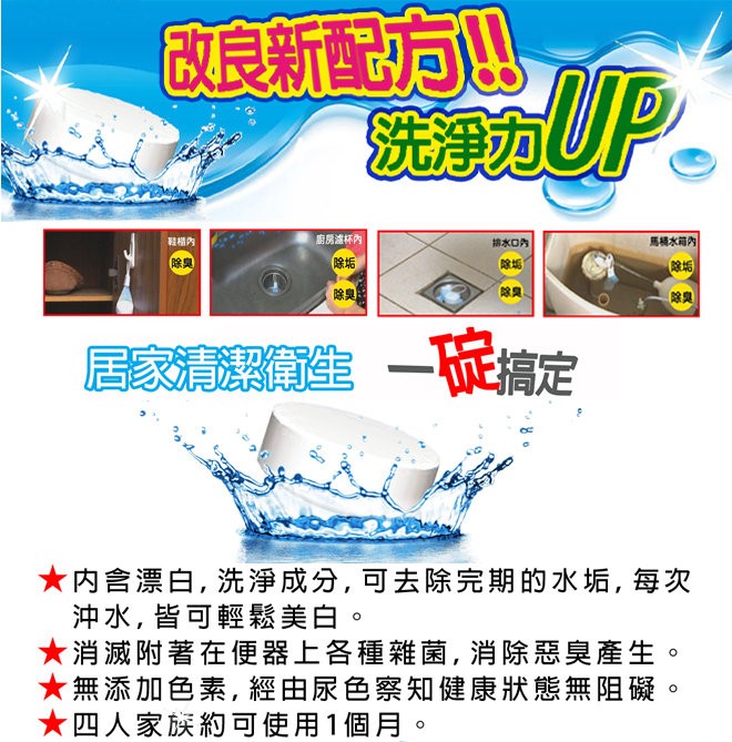 成 份:三氫異氫酸,特殊界面活性劑,檸檬酸,發泡劑,碳酸鈉,崩壞劑,過碳酸鈉,次氫酸鈣
