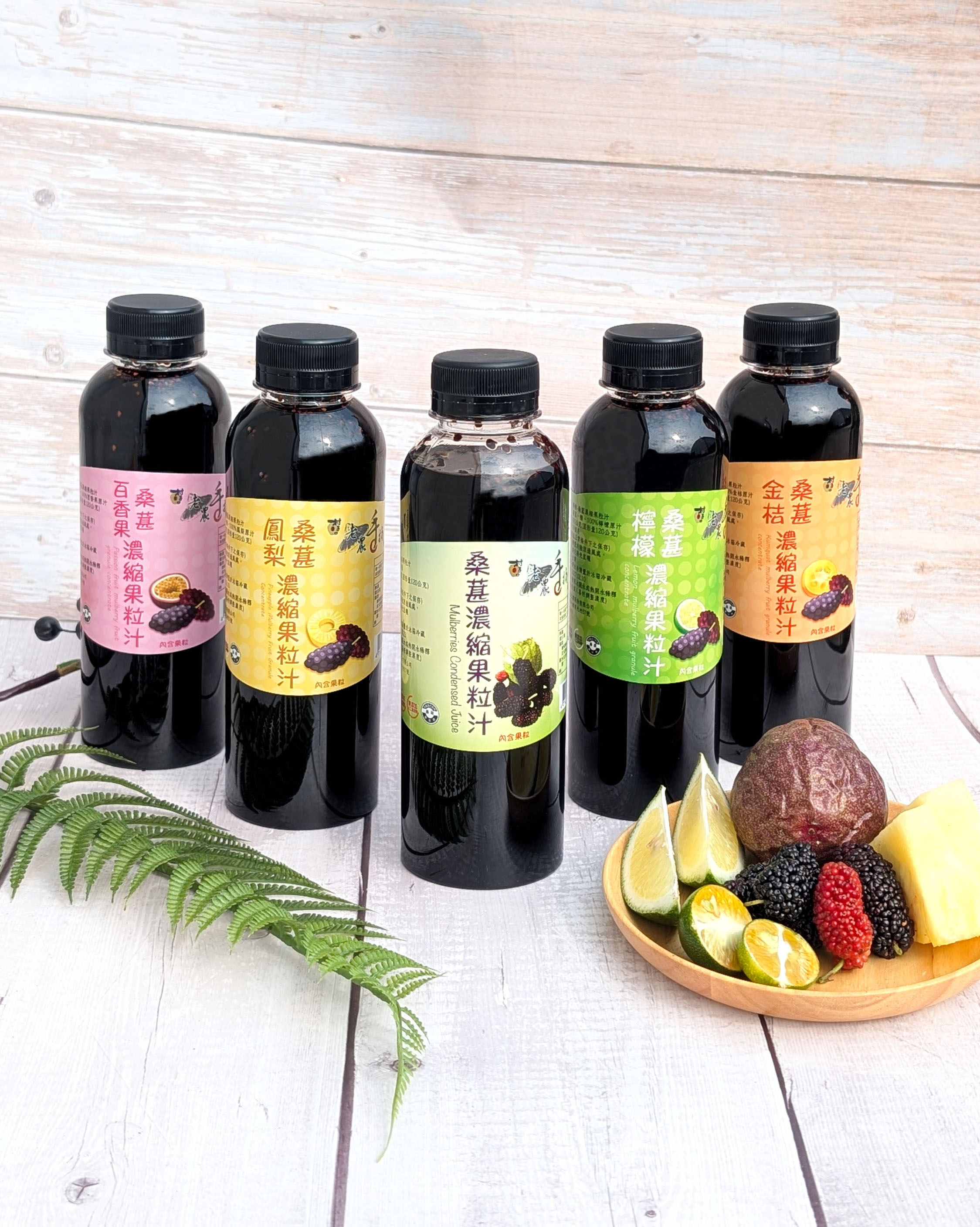 - 品項: 桑葚濃縮果粒汁 \ 金桔桑葚濃縮果粒汁 \ 鳳梨桑葚濃縮果粒汁 \ 百香果桑葚濃縮果粒汁 \ 檸檬桑葚濃縮果粒汁