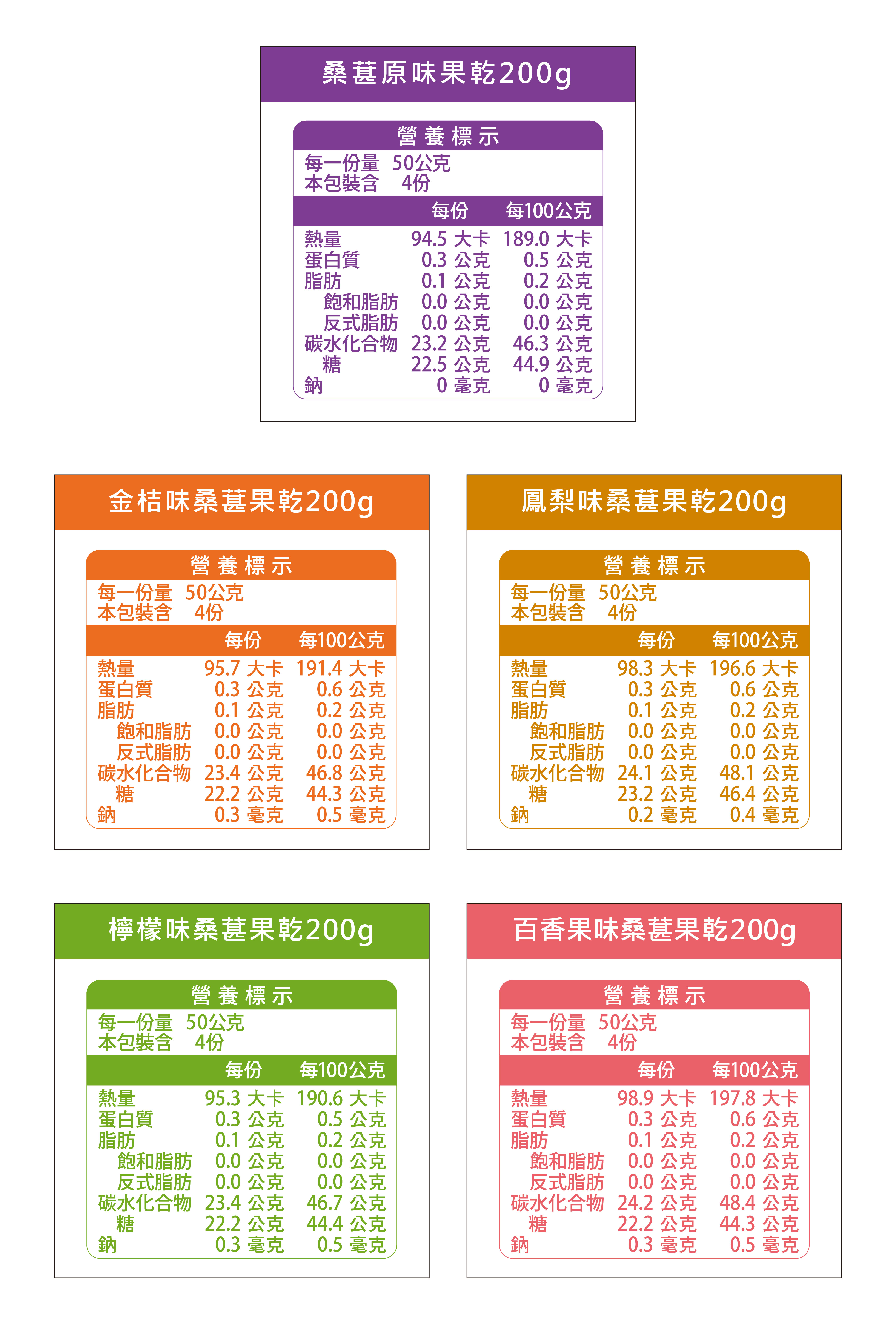 - 品項: 桑葚原味果乾(200g) \ 金桔味桑葚果乾(200g) \ 鳳梨味桑葚果乾(200g) \ 檸檬味桑葚果乾(200g) \ 百香果味桑葚果乾(200g)(內含百香果籽)