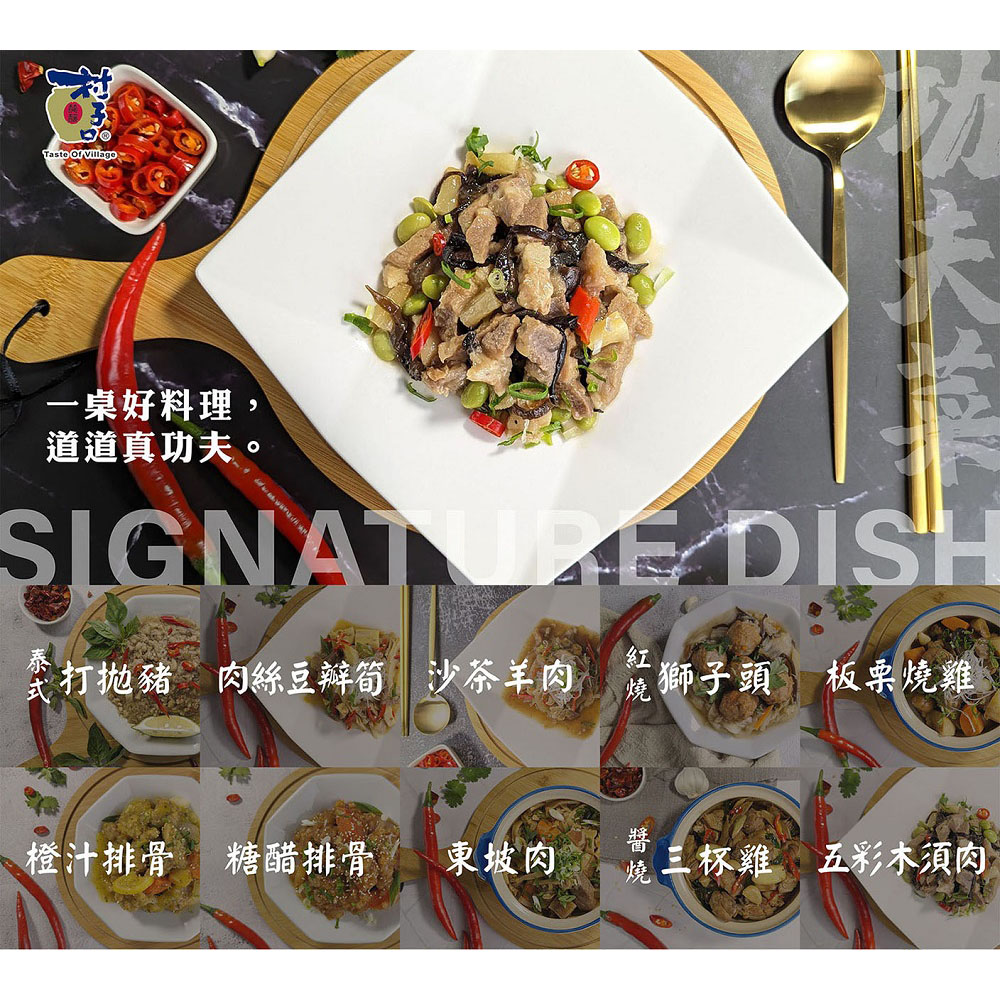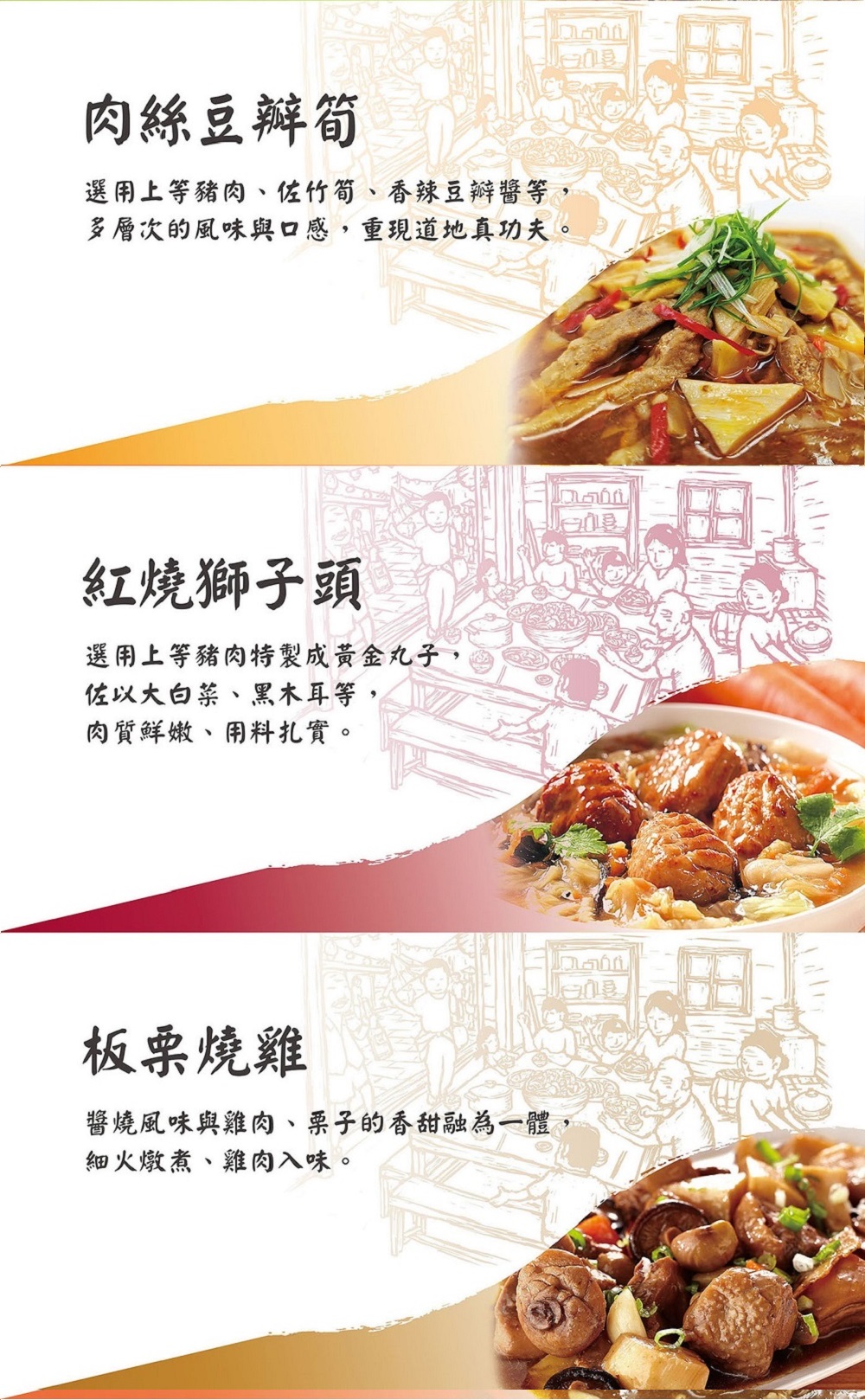 - 品項: 醬燒三杯雞 \ 紅燒獅子頭 \ 糖醋排骨 \ 東坡肉 \ 板栗燒雞 \ 橙汁排骨