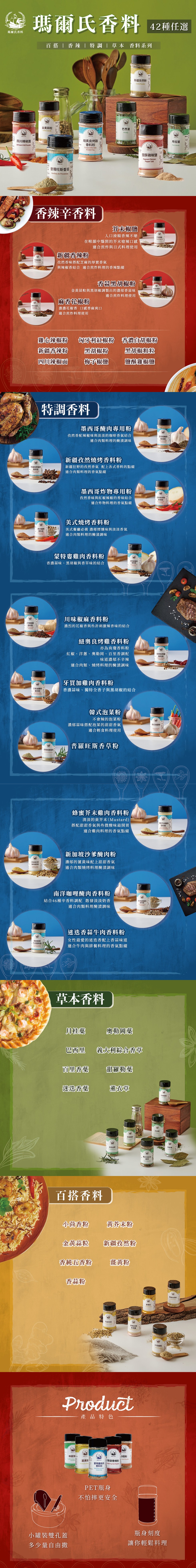 - 品項: 芥末椒鹽(純素) \ 卡宴辣椒粉(純素) \ 新疆香辣粉(五辛素) \ 黑胡椒粉(純素) \ 粗粒黑胡椒(純素) \ 香蒜黑胡椒粉(五辛素) \ 麻香花椒粉(純素) \ 匈牙利紅椒粉(純素) \ 梅子椒鹽(純素) \ 四川辣椒面(葷) \ 雞心辣椒(純素) \ 薑黃粉(純素) \ 新疆孜然粉(純素) \ 黃芥末粉(純素) \ 香蒜粉(五辛素) \ 金黃蒜粒(五辛素) \ 香純五香粉(純素) \ 小茴香粉(純素) \ 迷迭香葉(純素) \ 百里香葉(純素) \ 奧勒岡葉(純素) \ 甜羅勒葉(純素) \ 月桂葉(純素) \ 巴西里(純素) \ 薰衣草(純素) \ 義大利綜合香草(五辛素) \ 墨西哥醃肉專用粉(五辛素) \ 墨西哥炸物專用粉(五辛素) \ 蒙特婁雞肉香料粉(五辛素) \ 蜂蜜芥末雞肉香料粉(純素) \ 新加坡沙爹醃肉香料粉(純素) \ 美式燒烤香料粉(純素) \ 牙買加雞肉香料粉(五辛素) \ 迷迭香蒜牛肉香料粉(五辛素) \ 普羅旺斯香草(五辛素) \ 川味椒麻香料粉(純素)